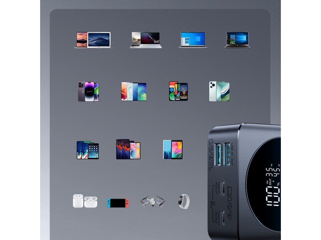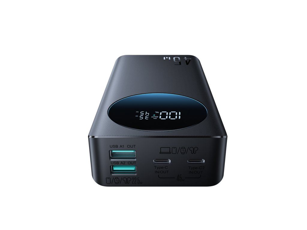 Podpora výkonu až 45W umožňuje rychlé a efektivní nabíjení široké škály zařízení. Powerbanka je vybavena dvěma USB-C a dvěma USB-A porty, takže můžete současně nabíjet až čtyři zařízení, což oceníte zejména při sdílení s dalšími uživateli nebo při používání více zařízení najednou.