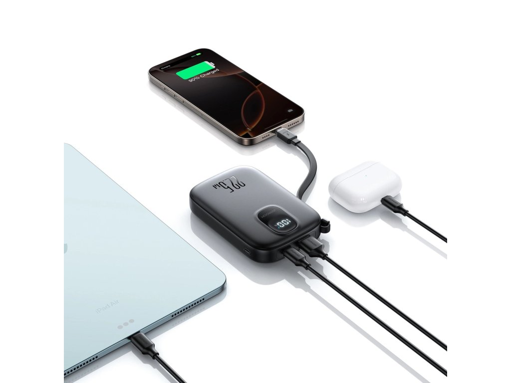 Powerbanka Joyroom JR-PBF17 je spolehlivý a stylový zdroj energie určený pro uživatele zařízení s portem USB-C. Vybavena integrovaným USB-C kabelem a dalším 25 cm kabelem poskytuje pohodlné a rychlé nabíjení bez nutnosti nosit s sebou další příslušenství. S kapacitou 10000mAh a výstupním výkonem až 22,5W vám umožní rychle dobít váš smartphone, tablet nebo sluchátka v jakékoli situaci. Díky kompaktním rozměrům a nízké hmotnosti se snadno vejde do tašky, batohu nebo kapsy. Pokročilé zabezpečení chrání před přehřátím, přetížením a zkratem, což zaručuje bezpečné a dlouhodobé používání.