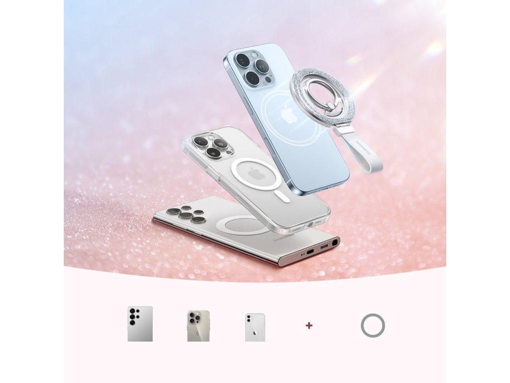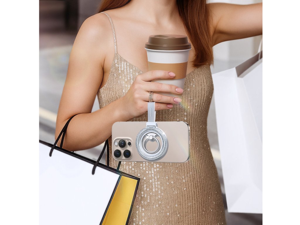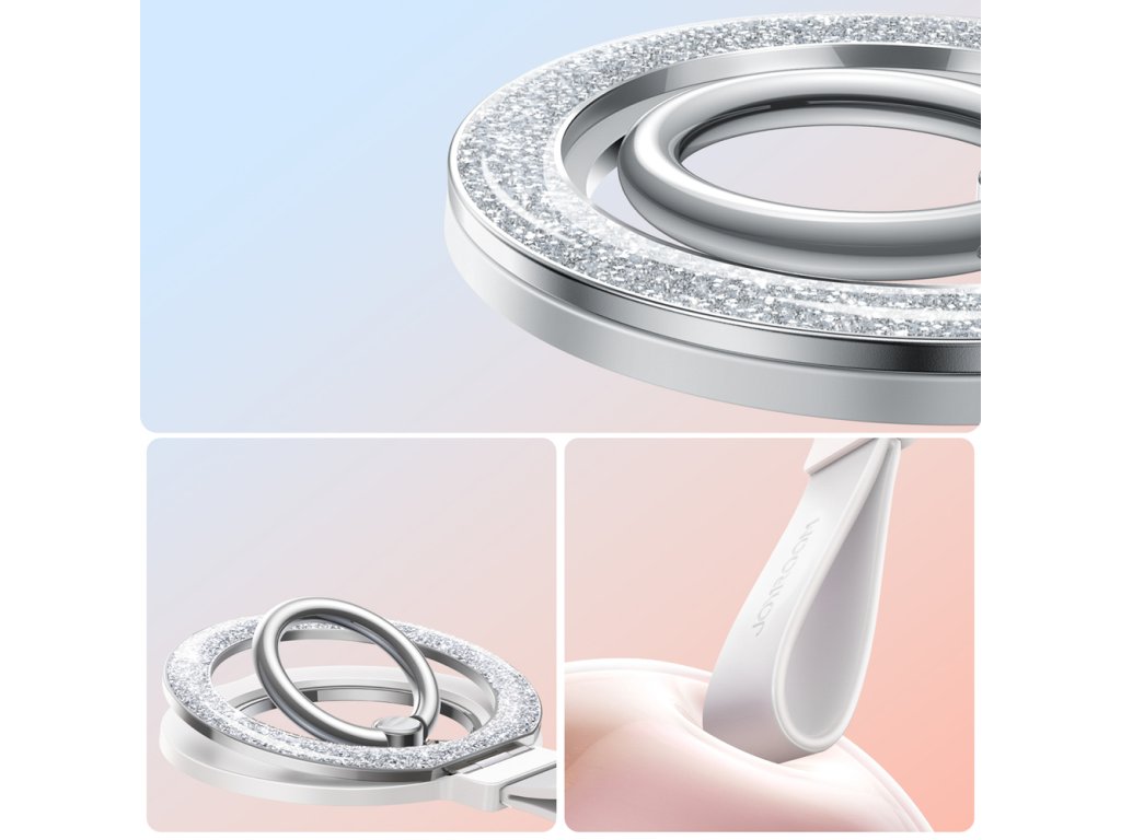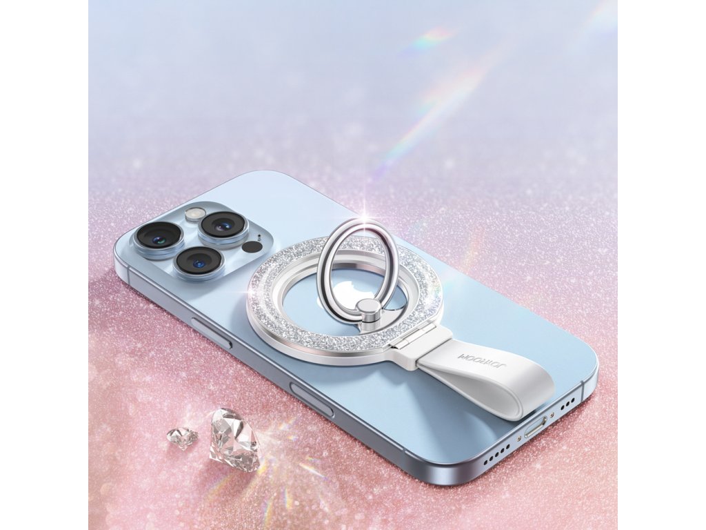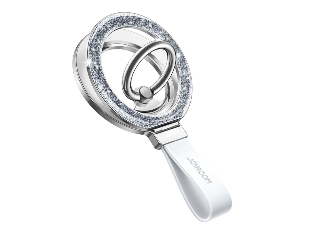 Držák Joyroom JR-ZS425 je stylový a funkční doplněk, který kombinuje módní design s praktickými řešeními. Lesklý, třpytivý okraj dodává vašemu smartphonu elegantní vzhled a zároveň poskytuje pohodlné a bezpečné držení. Díky silným magnetům N56 se držák okamžitě připevní k telefonům a magnetickým pouzdrům s technologií MagSafe a přiložený kovový kroužek umožňuje použití i s jinými modely. Otočný kroužek o 360st. a skládací stojánek o 120st. usnadňují používání telefonu – vertikálně i horizontálně. Toto praktické příslušenství zjednodušuje každodenní používání a dodává vašemu telefonu jedinečný nádech.