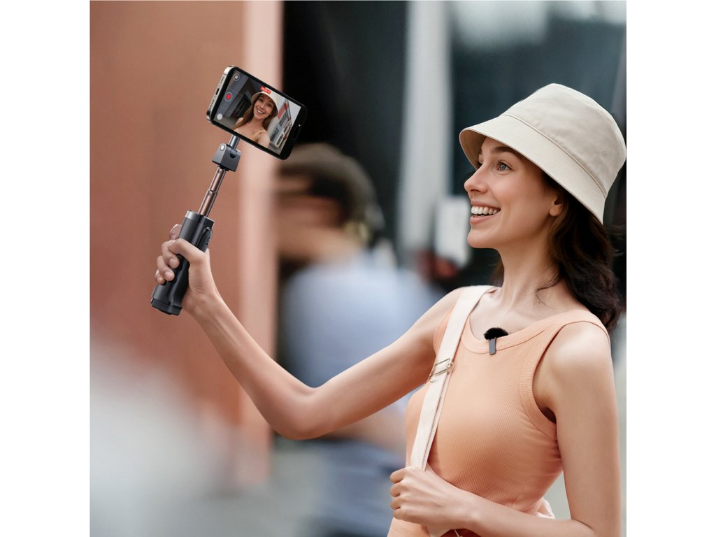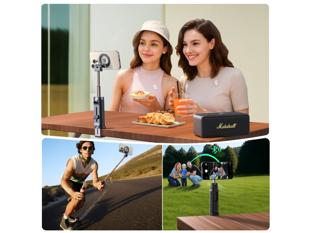 - Tři funkce v jednom zařízení: funguje jako selfie tyč, stativ a magnetický držák, což vám umožňuje nahrávat a fotografovat v jakékoli poloze.
