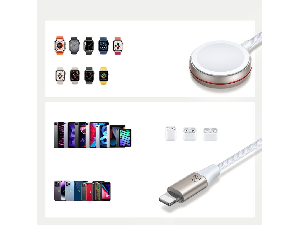- Kombinace indukční nabíječky pro Apple Watch a Lightning kabelu v jednom