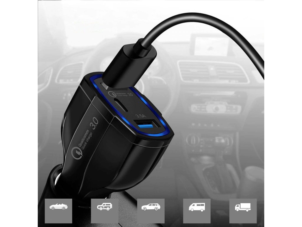 Inteligentní autonabíječka s 2 porty USB (QC3.0 a USB 3.1A) a 1x USB Typ C