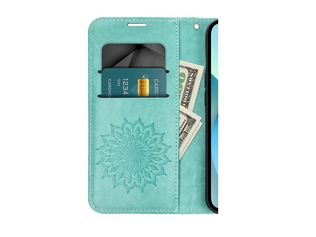 Designované pouzdro MEZZO s lisovaným vzorem MANDALA. Disponuje přihrádkami na platební karty nebo doklady, které jsou umístěné v odklopitelné přední části pouzdra.