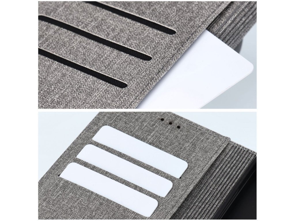 Perfektně padnoucí pružná kolébka pevně drží telefon a magnetická spona jej chrání proti náhodnému otevření. Pouzdro je vyrobeno z EKO kůže a materiálu připomínajícího JEANS, má všechny potřebné výřezy pro fotoaparát a porty.