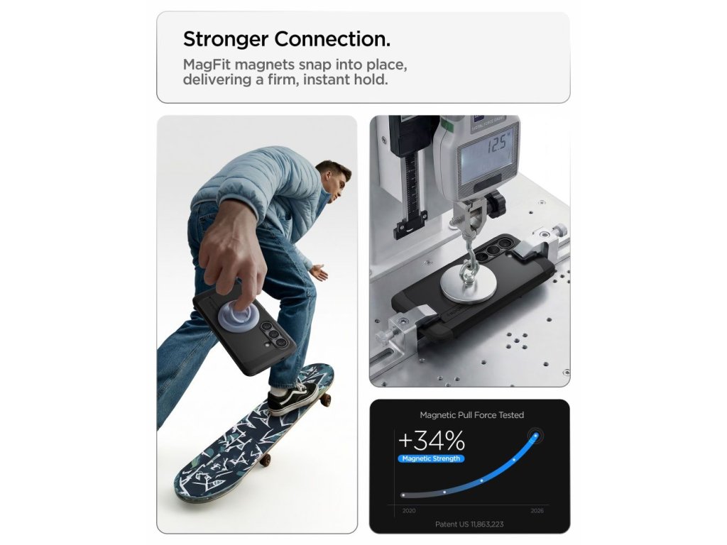 Spigen Tough Armor Mag Series je vylepšená verze oblíbeného odolného krytu, která kombinuje vysokou ochranu zařízení s plnou kompatibilitou s technologií MagSafe. Integrovaný magnetický kroužek umožňuje bezpečné přichycení k MagSafe příslušenství a podporuje pohodlné bezdrátové nabíjení bez nutnosti sundávání krytu.