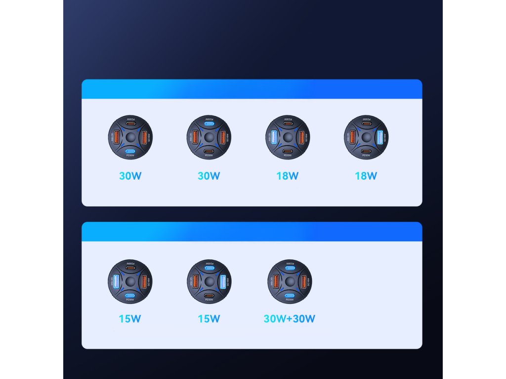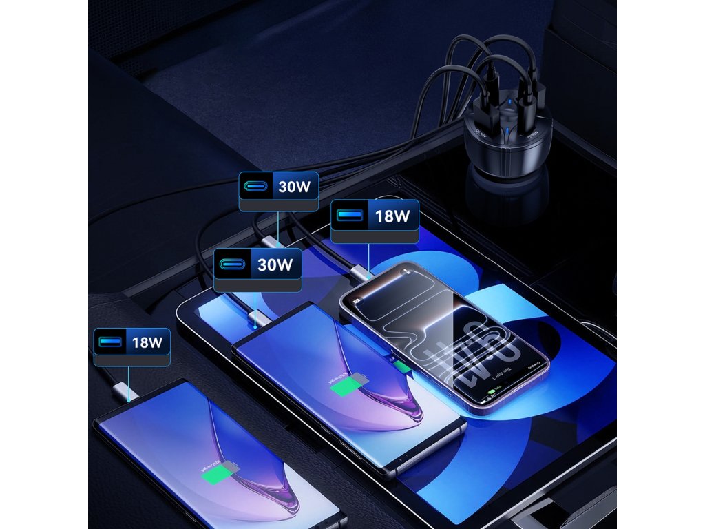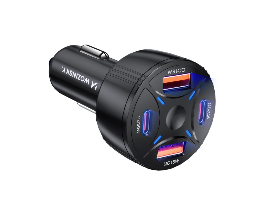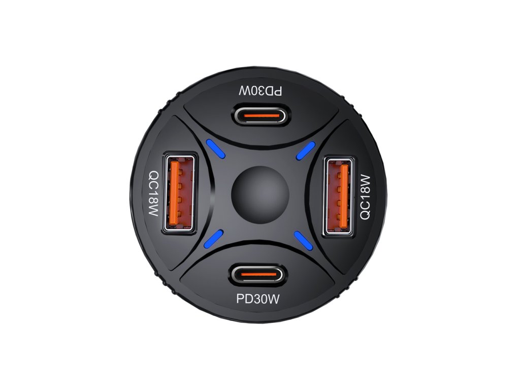 Nabíječka je vybavena dvěma moderními USB-C porty s výkonem až 30 W na port a dvěma USB-A porty, což umožňuje flexibilní kombinace nabíjení podle aktuálních potřeb. Široký vstupní rozsah 12–24 V zajišťuje kompatibilitu s většinou osobních i nákladních vozidel. Odolné ABS tělo je navrženo tak, aby spolehlivě obstálo v náročných automobilových podmínkách.