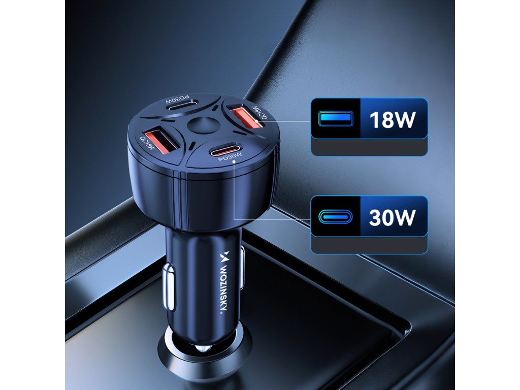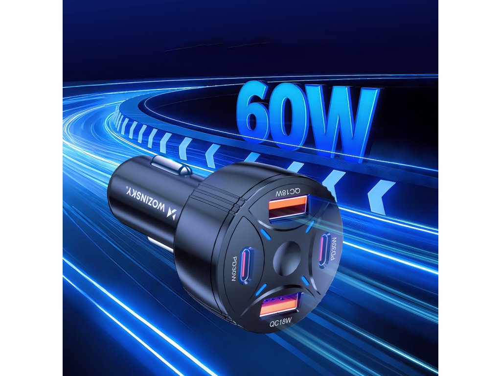 Wozinsky WLS-04 nabíječka do auta 2x USB-A + 2x USB-C / 60W / LED podsvícení - černá.
