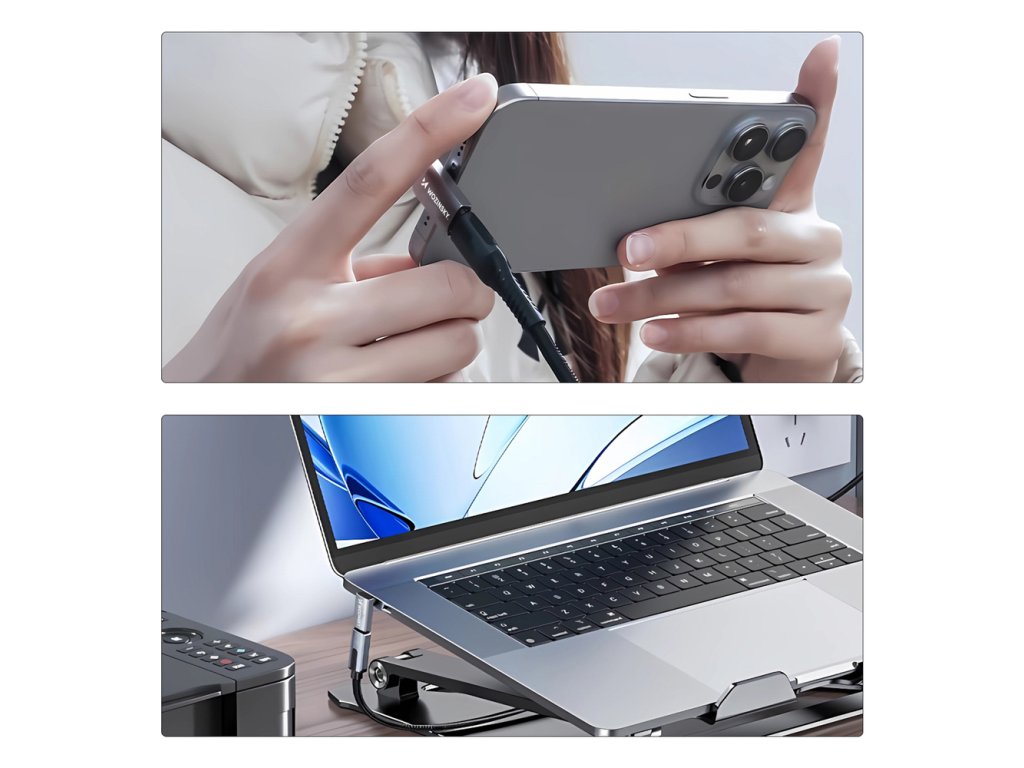 Úhlový adaptér Wozinsky WPKF-01 je příslušenství navržené pro pohodlí, odolnost a maximální výkon. Jeho úhlový design chrání porty a kabely zařízení před nadměrným opotřebením a zároveň poskytuje snadný přístup v těsných prostorech. Podporuje přenos dat rychlostí 40 Gb/s, rychlé nabíjení PD3.1 až 240 W a 8K video při 60 Hz. Je to všestranné řešení pro práci, zábavu a každodenní použití, ať už připojujete notebook, konzoli, telefon nebo tablet.