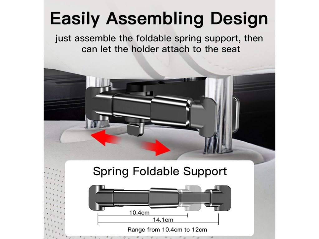 Držák využívá rozpěrný mechanismus, který zajišťuje pevné uchycení mezi tyče opěrky hlavy a zároveň širokou kompatibilitu s většinou automobilových sedadel dostupných na trhu. Maximální rozteč ramen až 27,8 cm umožňuje použití s různými typy zařízení včetně větších tabletů.